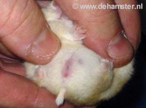 Wat je wél kan zien: bij Russen en Campbelli’s verschijnt kort na de bevruchting soms iets dat lijkt op een blauwe “punt” op het geslachtsdeel. Na een dag of 10 wordt de hamster breder op de flanken: dwerghamsters dragen hun jongen namelijk nogal aan de zijkant van hun lichaam – zo zit de buik niet in de weg als ze hard weg moeten hollen!